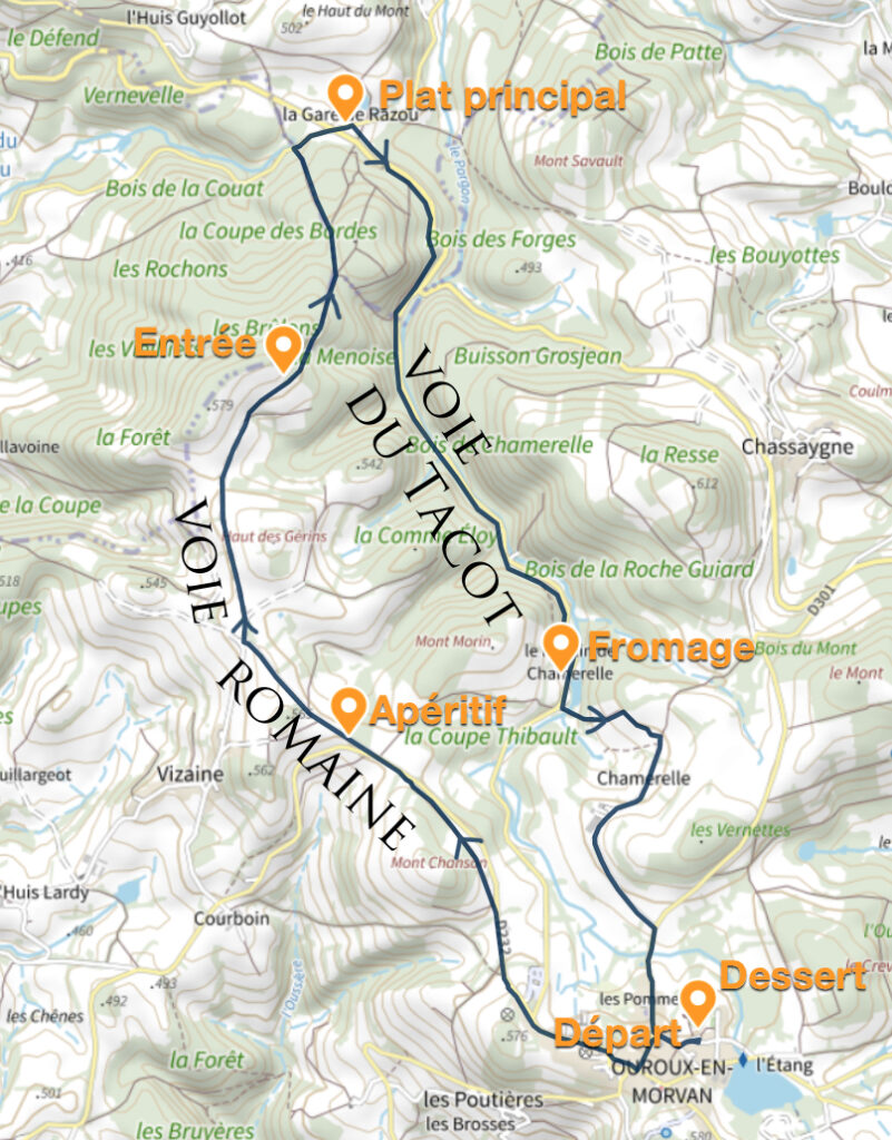 Pour fêter le fait qu’en 2025, le trajet du Tacot sera à nouveau praticable sur tout le territoire d’Ouroux-en-Morvan, nous vous proposons une balade gourmande : une boucle de 10 km sur l’ancienne voie romaine jusqu’à la Gare de Razou, et un retour par le chemin du Tacot qui monte doucement. Ce parcours est régulièrement interrompu par l’un des cinq plats d’un délicieux repas, accompagné d’un verre bien sûr.